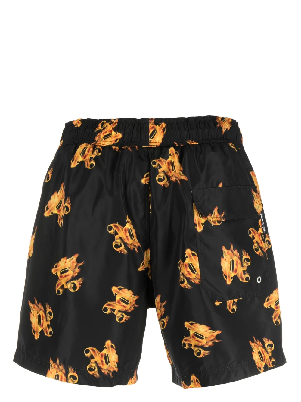 Zwart, zonsondergang geel, all-over grafische print, elastische tailleband met trekkoord, twee steekzijzakken en achterzak met klep. Zwemkleding moet over je eigen kleding worden aangepast..