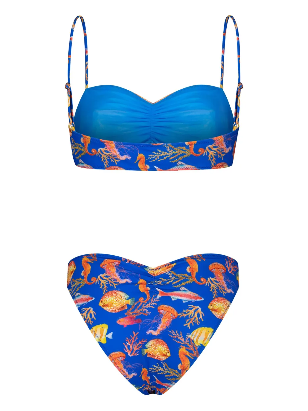 blauw zeeprint ruchedetails verstelbare bandjes bandeau top Zwemkleding moet over je eigen kleding worden aangepast.