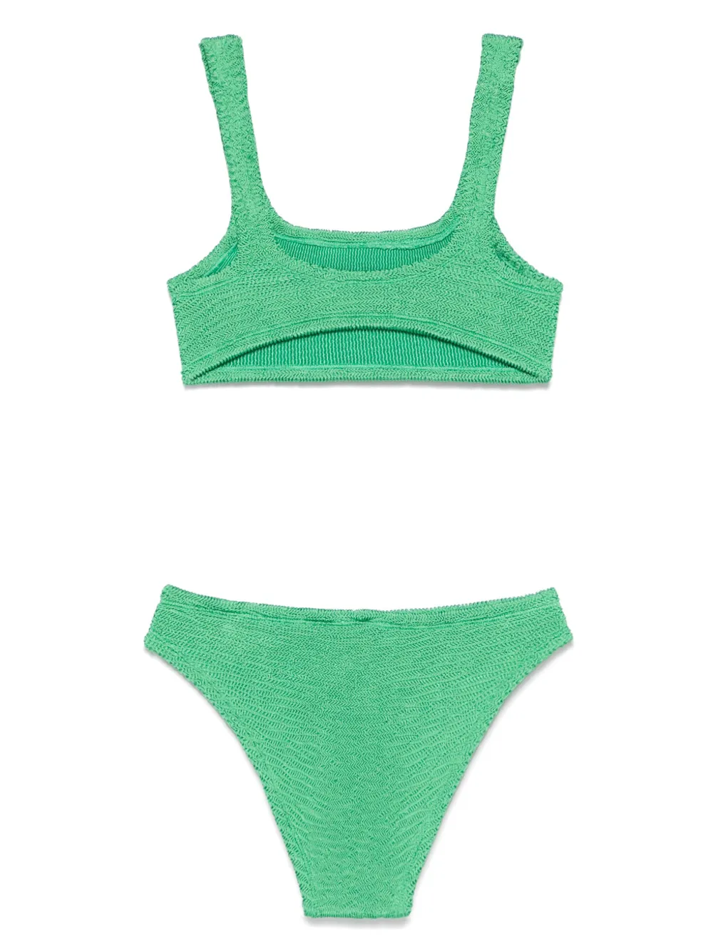 grasgroen gekreukte afwerking stretch design set van twee Bikinitop: vierkante hals mouwloos elastische band laag uitgesneden rug ongevoerd Bikinibroek: low waist elastische tailleband ongevoerd Zwemkleding moet over je eigen kleding worden aangepast.