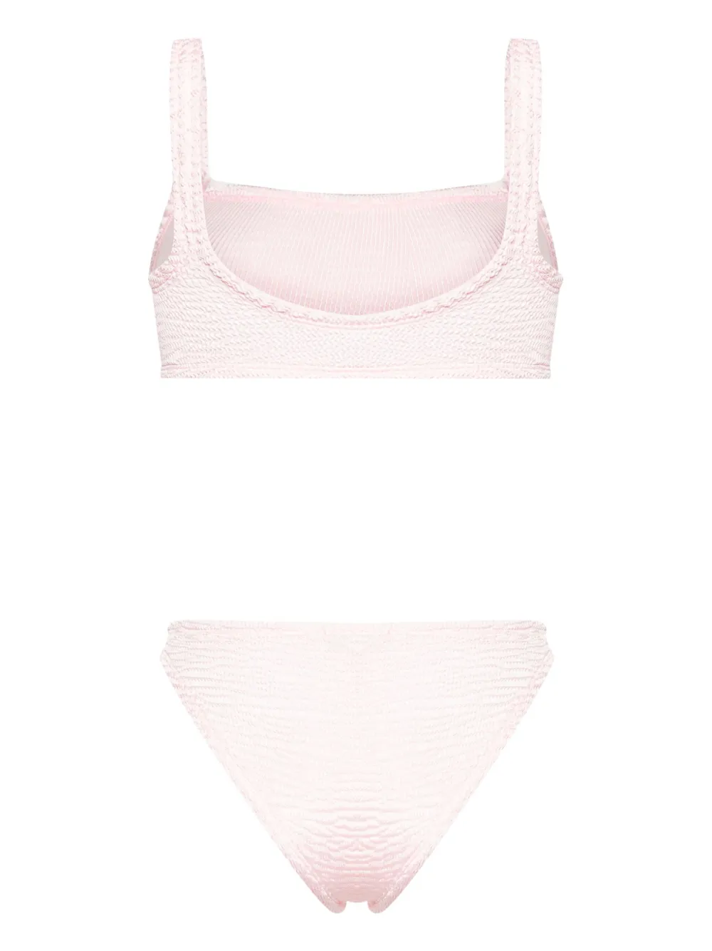 lichtroze stretch design gesmockt vlak Bikinitop: ronde hals dunne schouderbandjes laag uitgesneden rug Bikinislip: high waist hoog uitgesneden ongevoerd Zwemkleding moet over je eigen kleding worden aangepast.