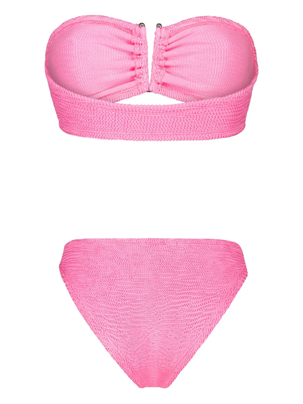 fluorescerend roze gekreukte afwerking stretch design set van twee Bikinitop: bandeau vierkante hals strapless ringdetail ruchedetails elastische band ongevoerd Bikinibroek: low waist elastische tailleband ongevoerd Zwemkleding moet over je eigen kleding worden aangepast.