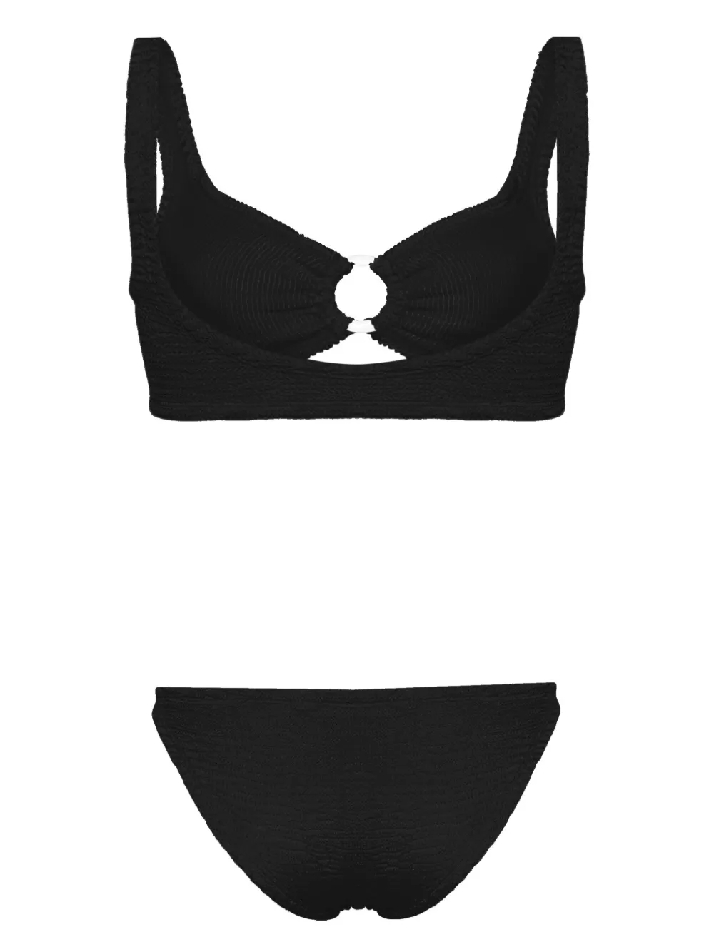 zwart stretch design gekreukelde afwerking Bikinitop: ringdetail V-hals dunne schouderbandjes laag uitgesneden rug elastische band Bikinislip: low waist elastische tailleband klassieke bikinislip Zwemkleding moet over je eigen kleding worden aangepast.