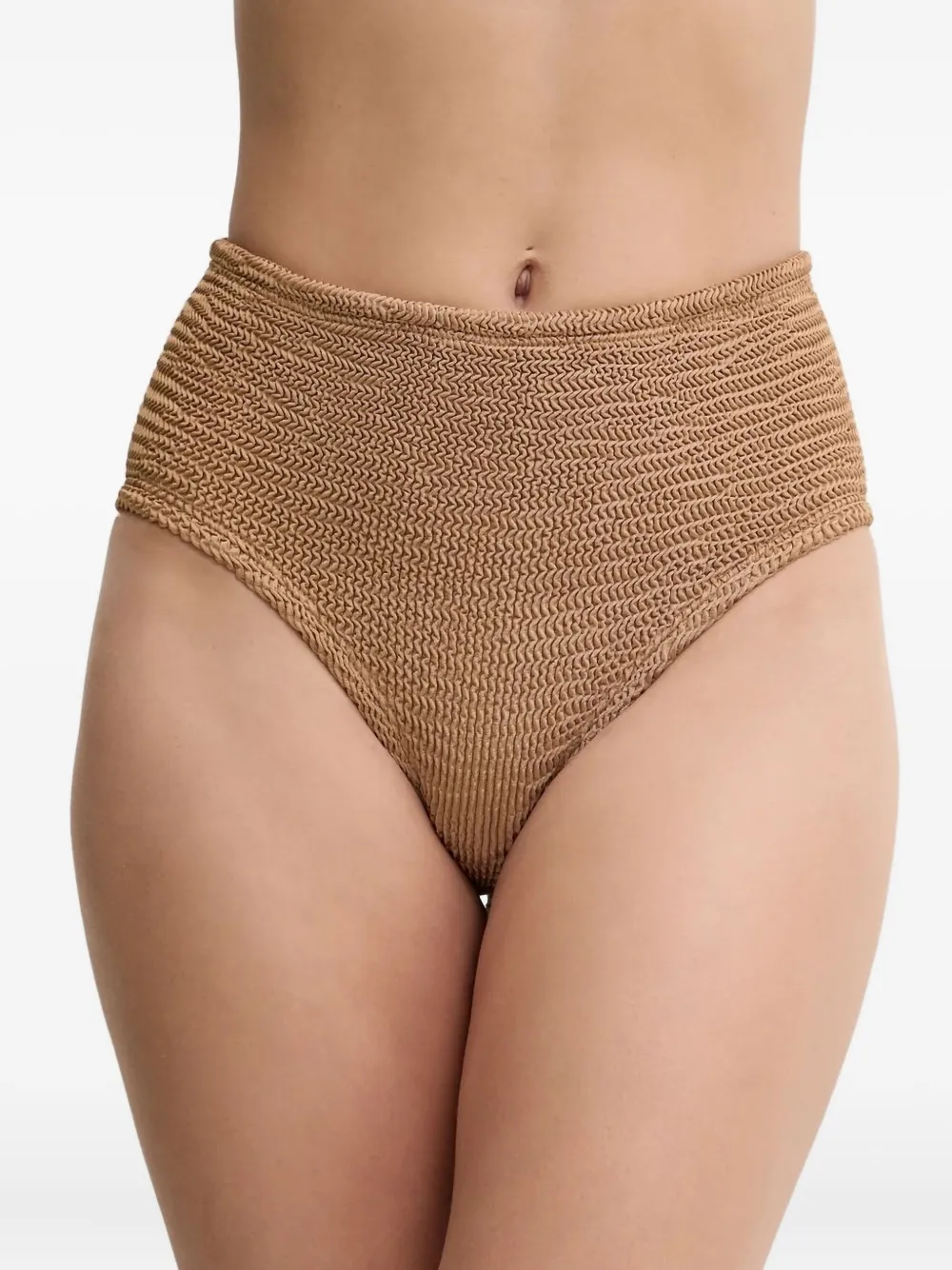 camel seersuker high waist bikinibroek bandeau top Zwemkleding moet over je eigen kleding worden aangepast.