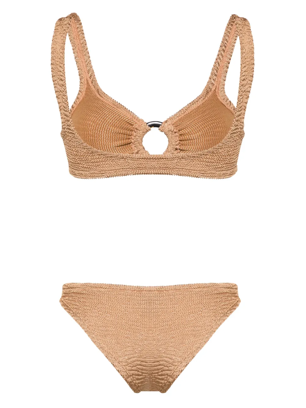 camelbruin stretch design getextureerde afwerkingTop: sweetheart-hals uitgesneden detail laag uitgesneden rugBroek low waist ongevoerd instapmodel Zwemkleding moet over je eigen kleding worden aangepast.