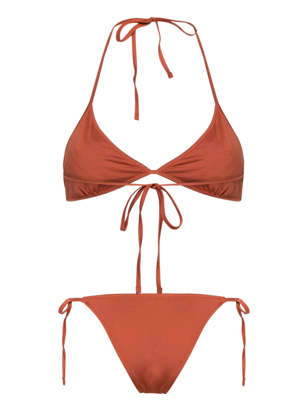 terracottabruin gerecyclede polyesterblend stretch design verfraaid met Swarovski-kristallen volledige voering triangel cup halternek striksluiting striksluiting aan de achterkant mid waist bikinibroek met striksluiting aan de zijkant Zwemkleding moet over je eigen kleding worden aangepast.