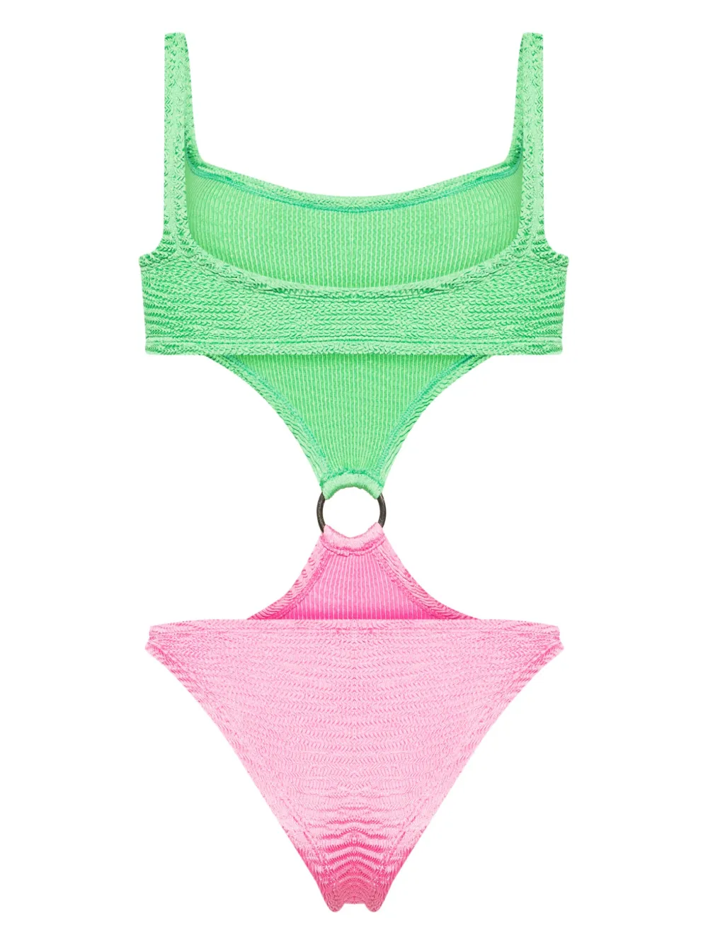 groen/roze stretch design design met colourblocking gekreukte afwerking gerimpeld effect uitgesneden detail ringdetail vierkante hals mouwloos rechte open rug high waist hoog uitgesneden ongevoerd Zwemkleding moet over je eigen kleding worden aangepast.
