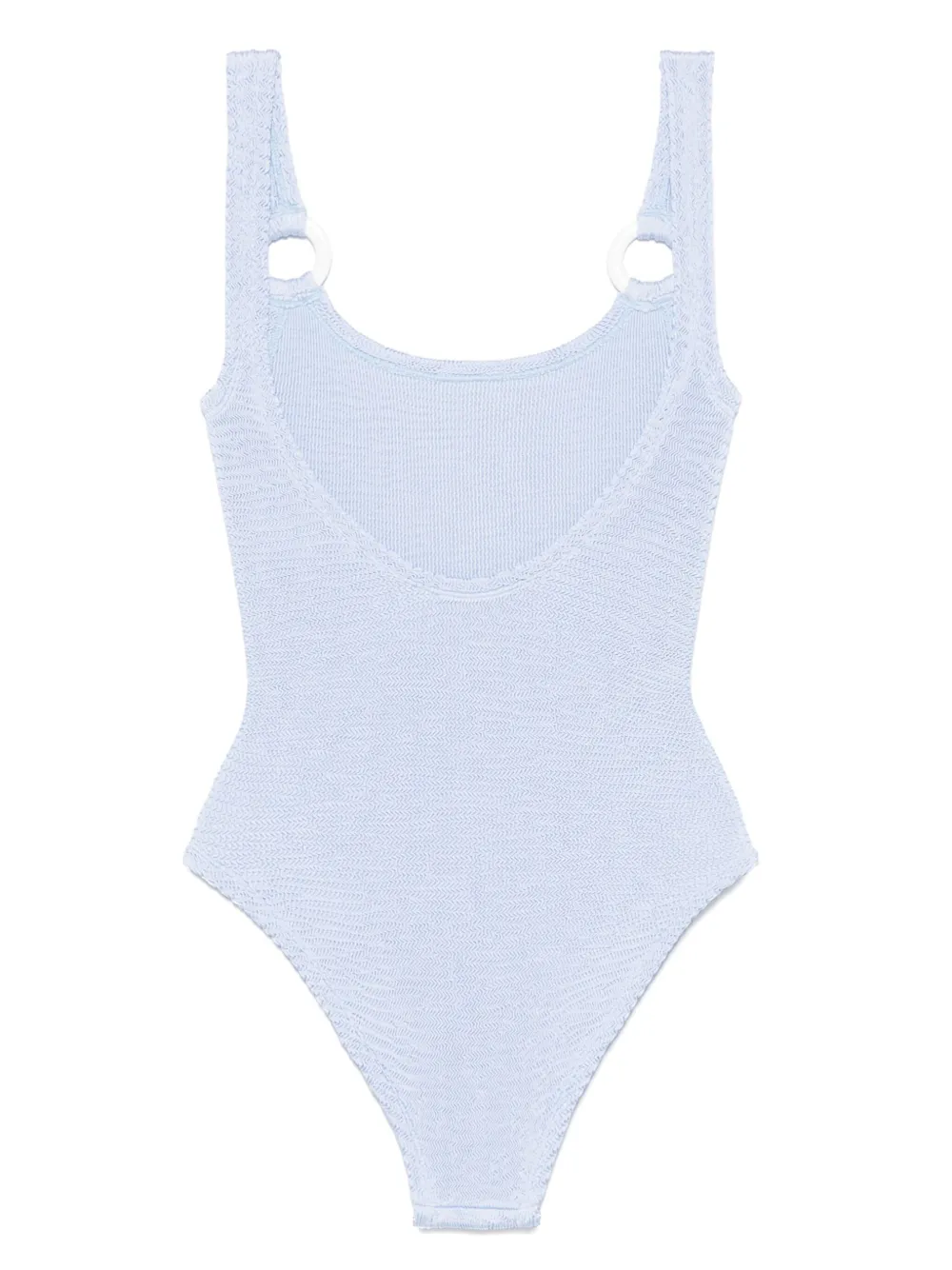 korenbloemblauw gekreukte afwerking stretch design vierkante hals ringdetail mouwloos lage rug hoog uitgesneden ongevoerd Zwemkleding moet over je eigen kleding worden aangepast.