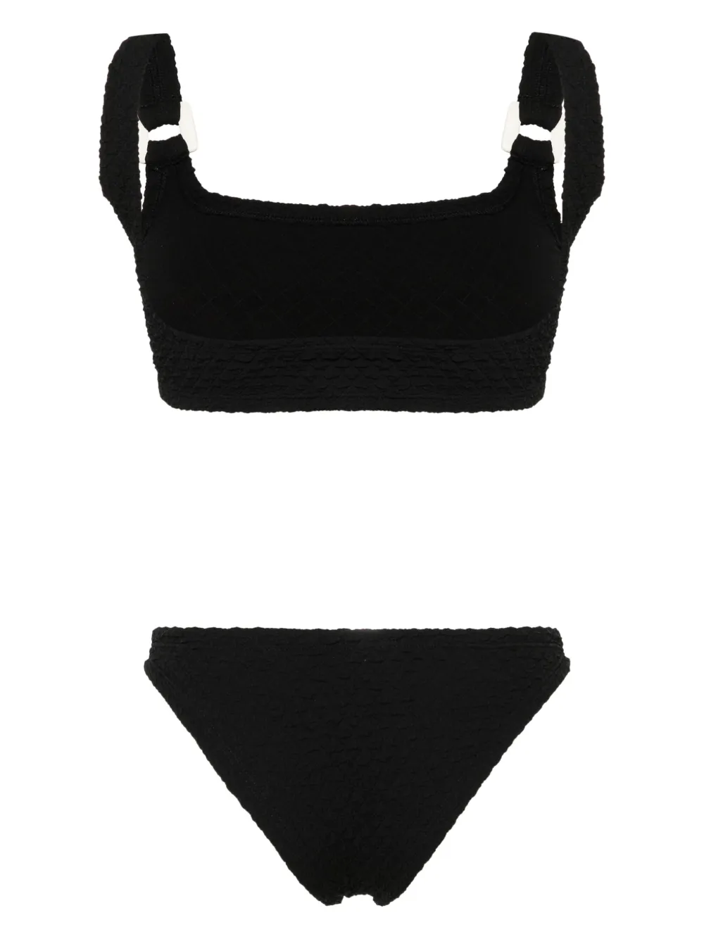 zwart stretch design getextureerde afwerking vierkante detailsTop: vierkante hals mouwloos rechte open rugBroek hoog uitgesneden ongevoerd instapmodel Zwemkleding moet over je eigen kleding worden aangepast.