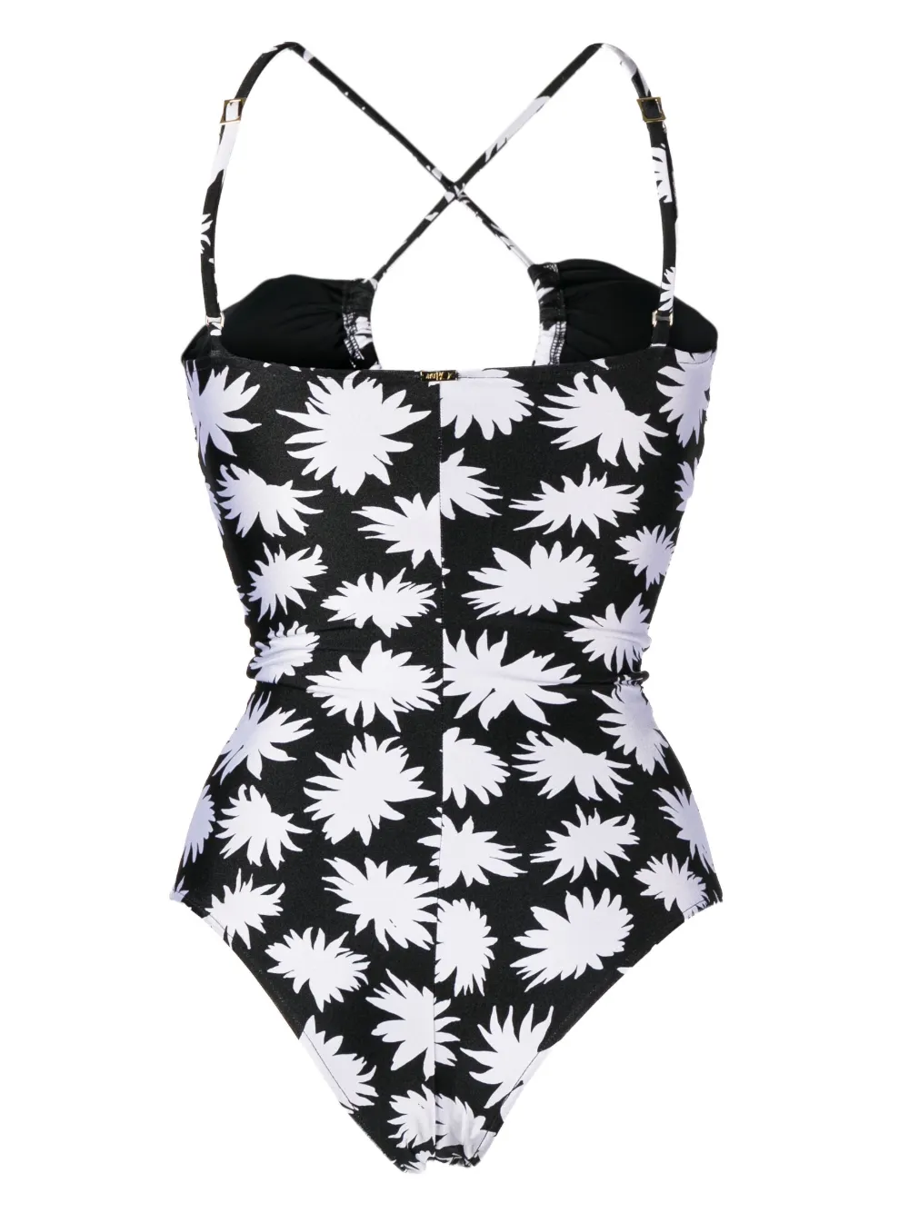 Zwart/wit, stretch design, uitgesneden detail , all-over bloemenprint en gekruiste schouderbandjes. Zwemkleding moet over je eigen kleding worden aangepast..