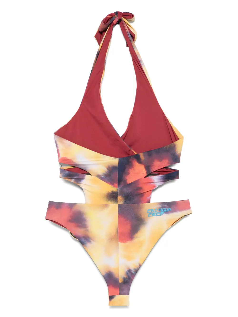 bordeauxrood halternek striksluiting rubberen logodetail uitgesneden detail Zwemkleding moet over je eigen kleding worden aangepast.