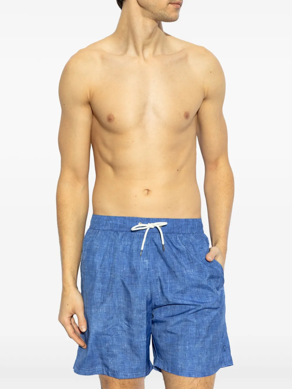 indigo elastische tailleband met trekkoord twee steekzakken aan de zijkant klepzak aan de achterkant Zwemkleding moet over je eigen kleding worden aangepast.