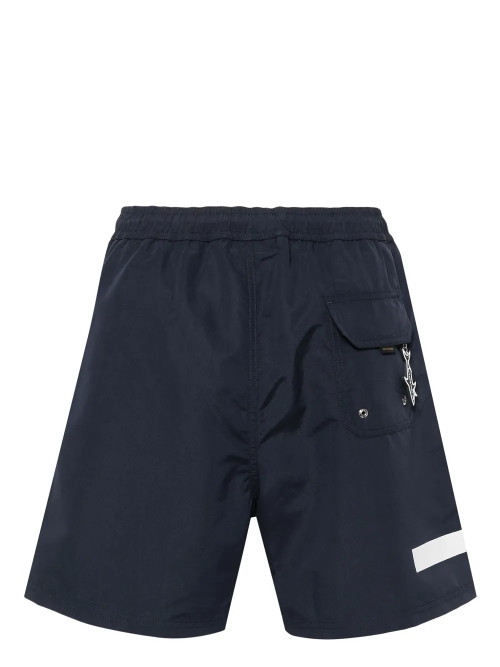 marineblauw logoprint op de voorkant mini logo label sleutelhanger met logo mid waist elastische tailleband met trekkoord twee steekzakken aan de zijkant klepzak aan de achterzijde inwendige mesh slip rechte zoom Zwemkleding moet over je eigen kleding worden aangepast.