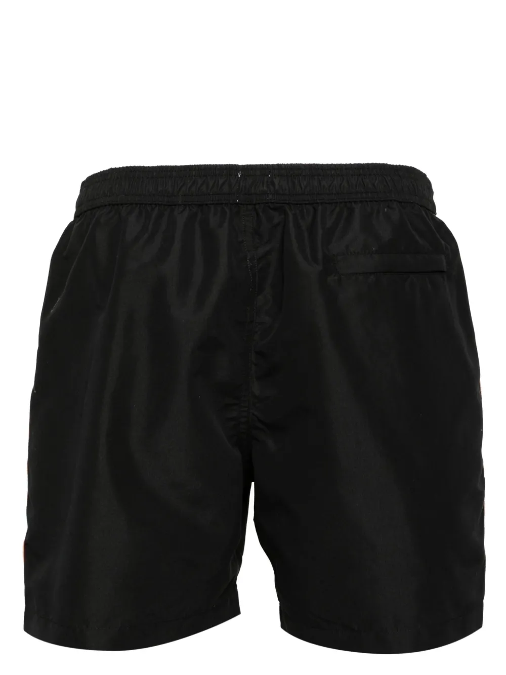 zwart gerecycled polyester lint afwerking drukknoopsluiting en rits aan de voorkant elastische tailleband aan de achterkant twee steekzakken aan de zijkant achterzak met ritssluiting rechte pijpen gedeeltelijk gevoerd Zwemkleding moet over je eigen kleding worden aangepast.