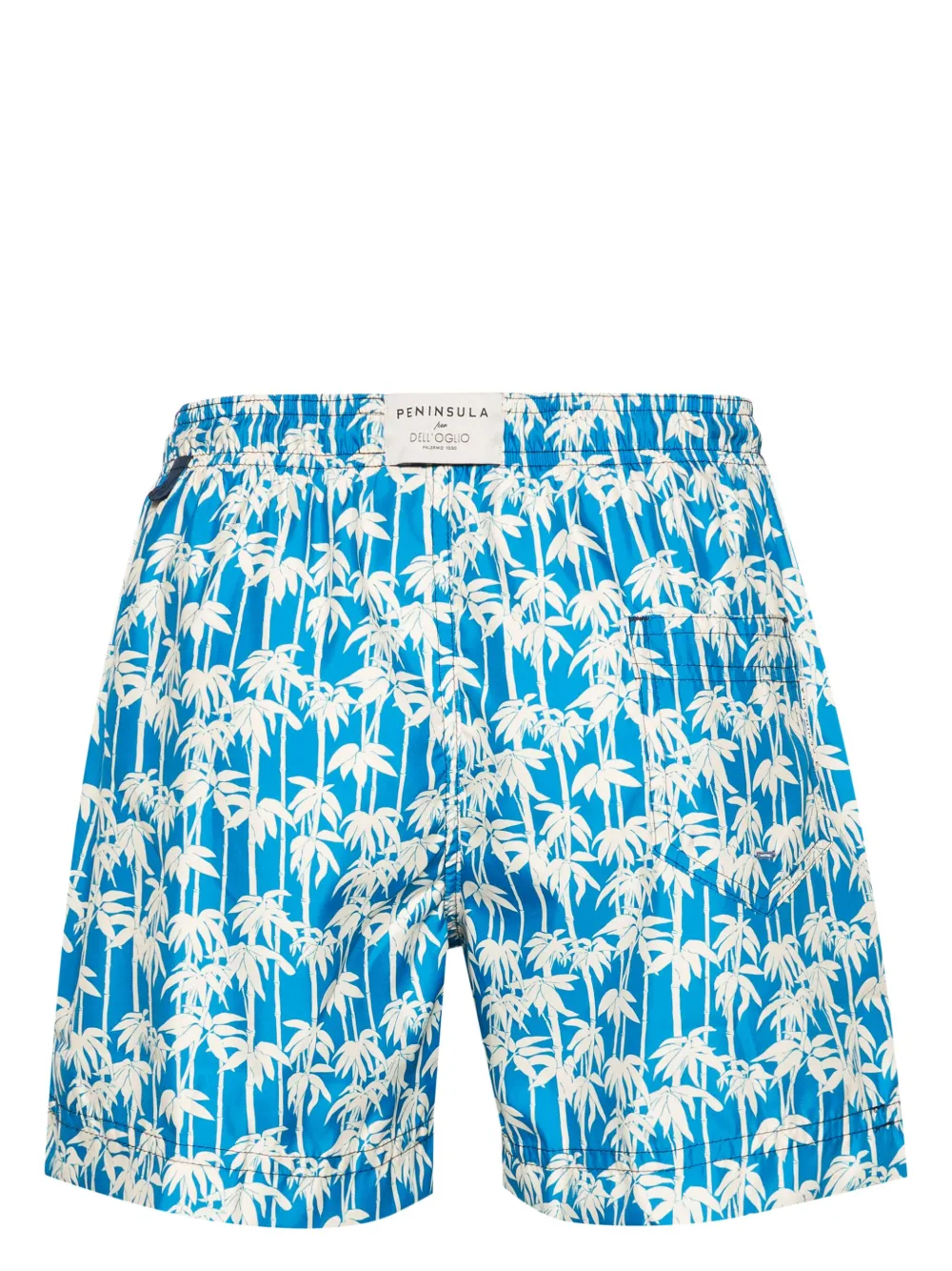 blauw/beige gerecycled polyester palmboomprint elastische tailleband met trekkoord twee ingenaaide zijzakken opgestikte zak aan de achterkant volledige voering Zwemkleding moet over je eigen kleding worden aangepast. ^