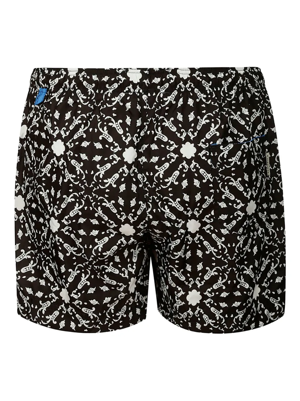 zwart barokprint trekkoordsluiting steekzijzakken opgestikte zak aan de achterkant Zwemkleding moet over je eigen kleding worden aangepast.