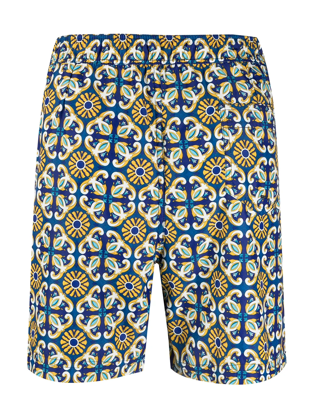 Geometrische print en elastische tailleband. Wij verzoeken je om zwemkleding over je eigen ondergoed aan te passen..