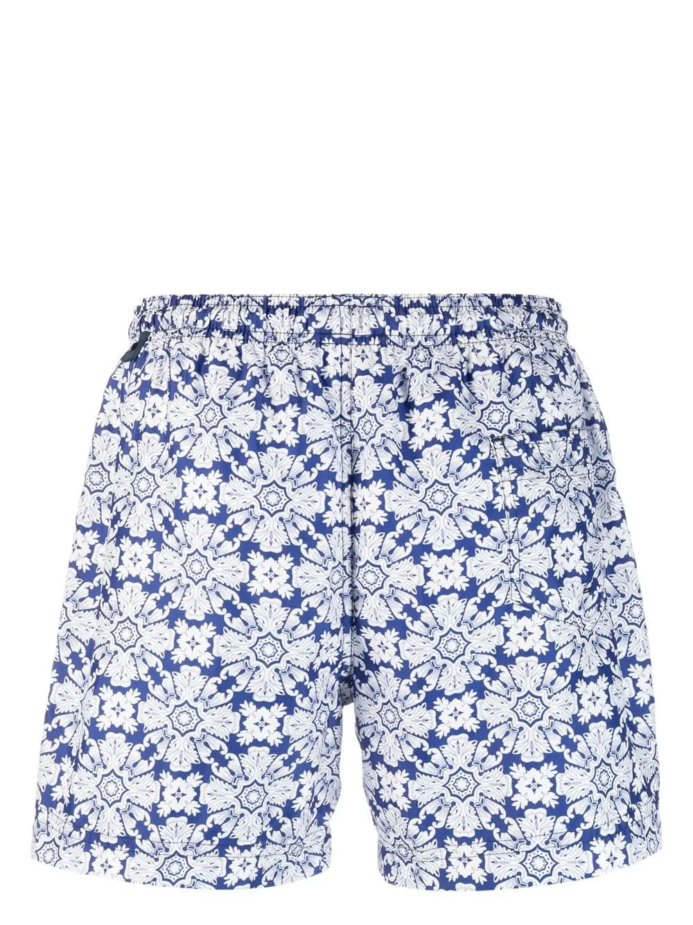 Blauwe saffier, gerecycled polyester, geometrische print, mini logo label, elastische tailleband met trekkoord en opgestikt vak aan de achterkant. Zwemkleding moet over je eigen kleding worden aangepast.. .