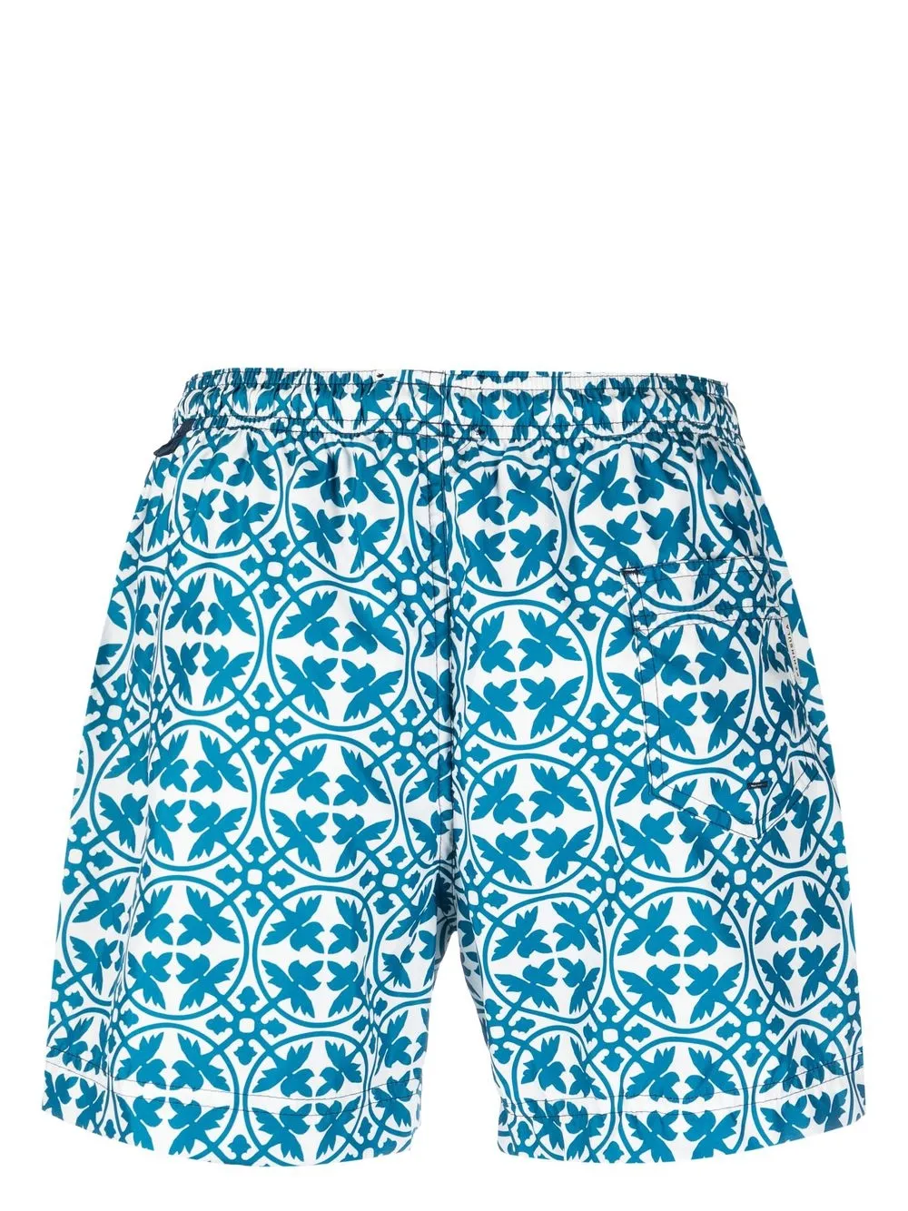 Blauwgroen blauw, gerecycled polyester, geometrische print, mini logo label, elastische tailleband met trekkoord en opgestikt vak aan de achterkant. Zwemkleding moet over je eigen kleding worden aangepast.. .