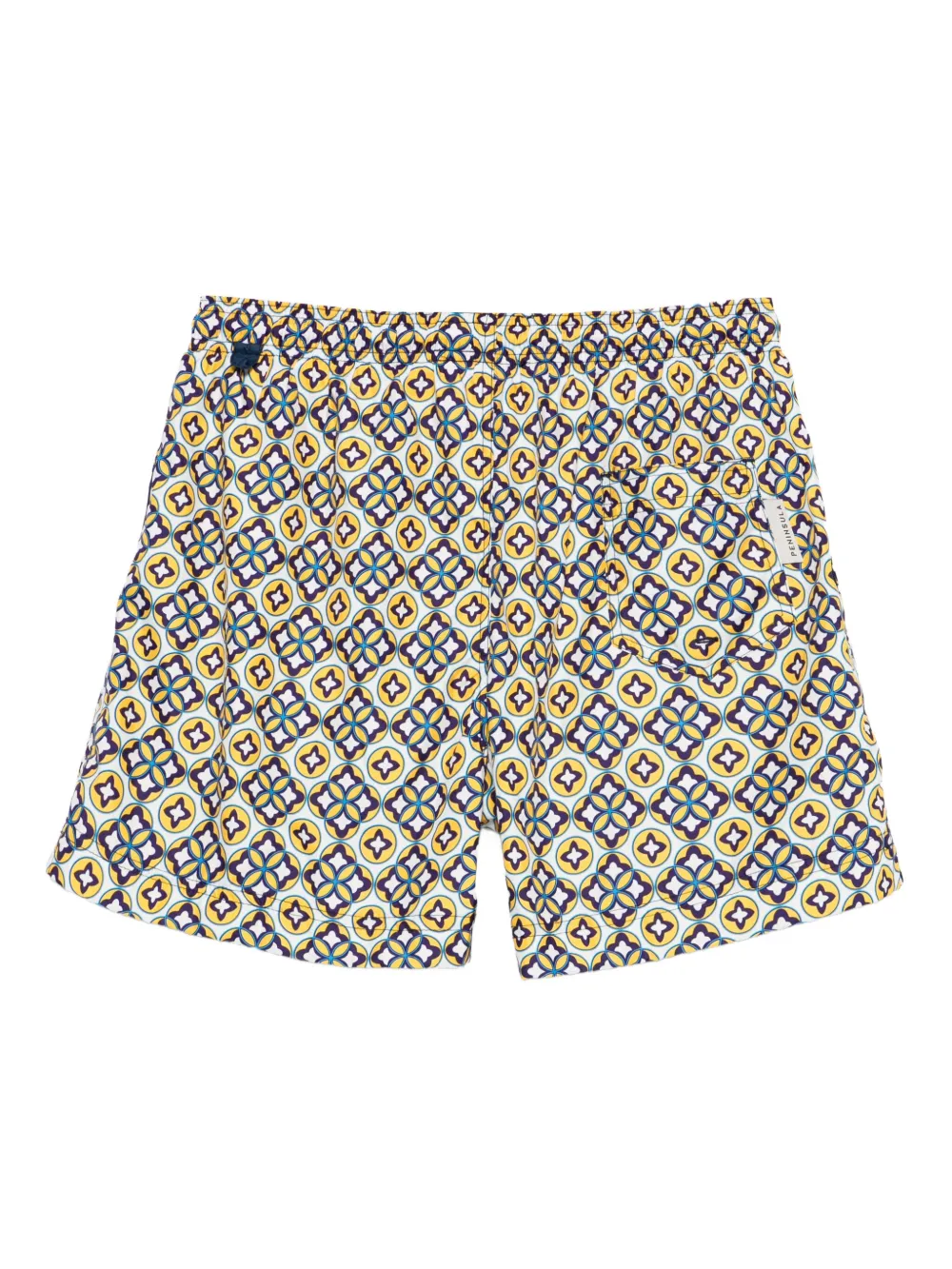 gebroken wit geometrisch patroon trekkoordsluiting platte voorkant zijzakken gerecycled polyester Zwemkleding moet over je eigen kleding worden aangepast.