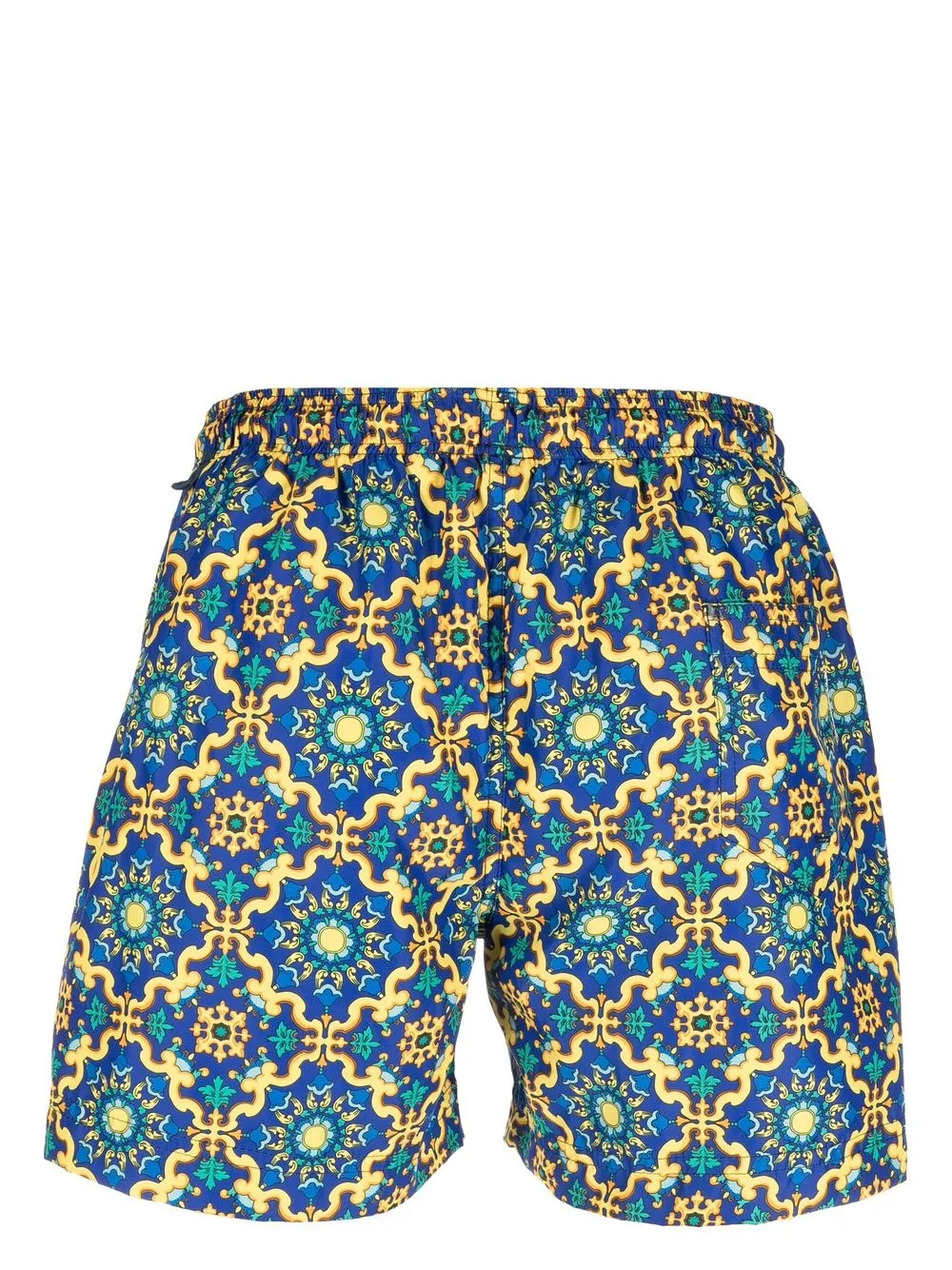 blauw/geel gerecycled polyester all-over grafische print elastische tailleband met trekkoord twee steekzakken aan de zijkant opgestikte zak aan de achterkant Zwemkleding moet over je eigen kleding worden aangepast.