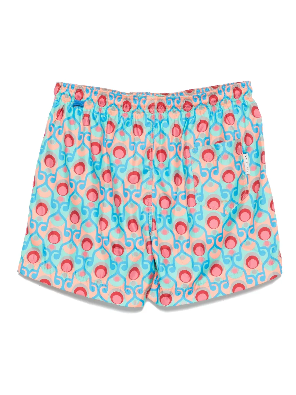 lichtblauw koraalrood patroon geometrische print trekkoordsluiting elastische tailleband platte voorkant Zwemkleding moet over je eigen kleding worden aangepast.