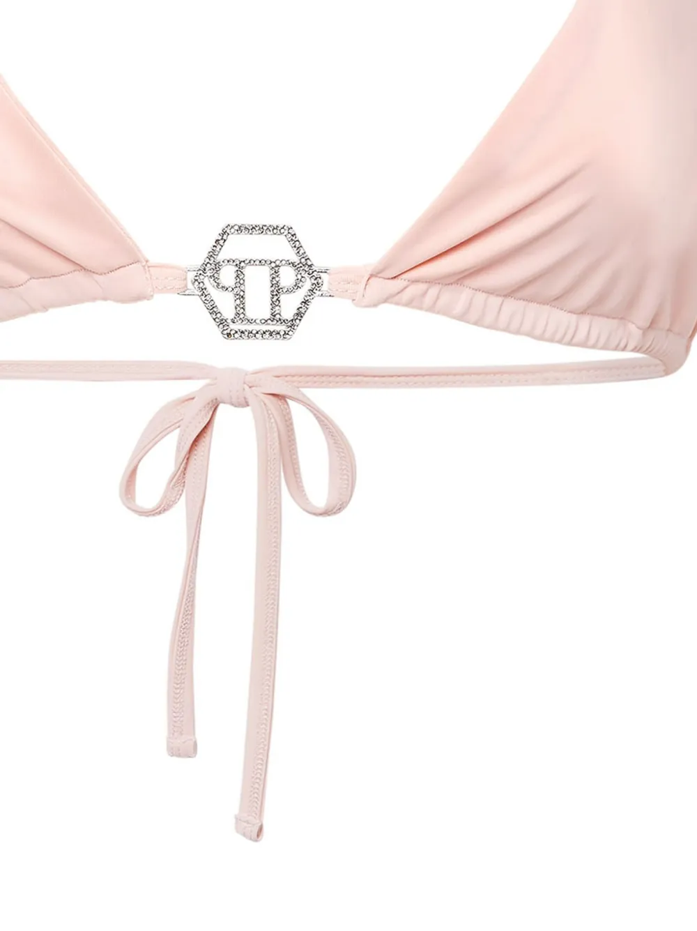 lichtroze stretch designBikinitop zilverkleurig logoplakkaat driehoekige vorm halternek striksluiting striksluiting aan de achterkantbikinibroek bikinibroek met striksluiting aan de zijkant elastische tailleband Zwemkleding moet over je eigen kleding worden aangepast.