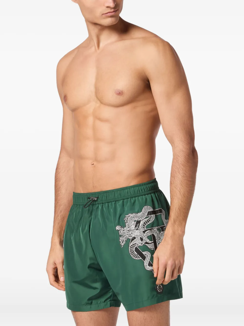 diepgroen elastische tailleband trekkoordsluiting contrasterende drakenprint zijzakken achterzak logopatch Zwemkleding moet over je eigen kleding worden aangepast.