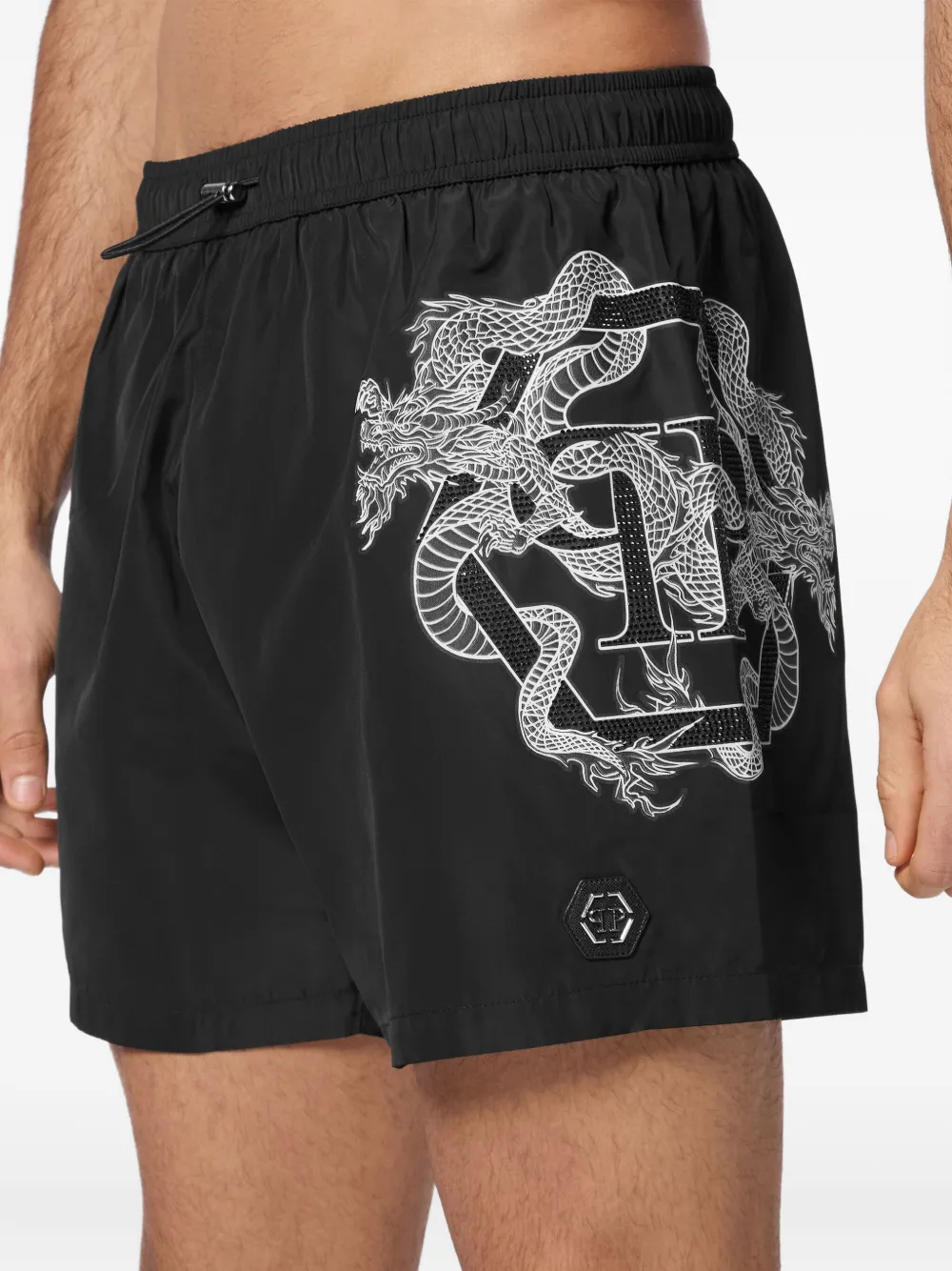 zwart elastische tailleband trekkoord-detail zijzakken gedurfde draak print logo-embleem lichtgewicht design lengte tot boven de knie Zwemkleding moet over je eigen kleding worden aangepast.
