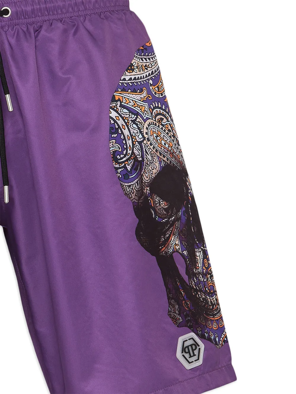 Druivenpaars, doodskopprint, logopatches aan de voorkant, elastische tailleband met trekkoord, twee steekzijzakken, paspelzak aan de achterkant, rechte zoom en lengte tot boven de knie. Zwemkleding moet over je eigen kleding worden aangepast..