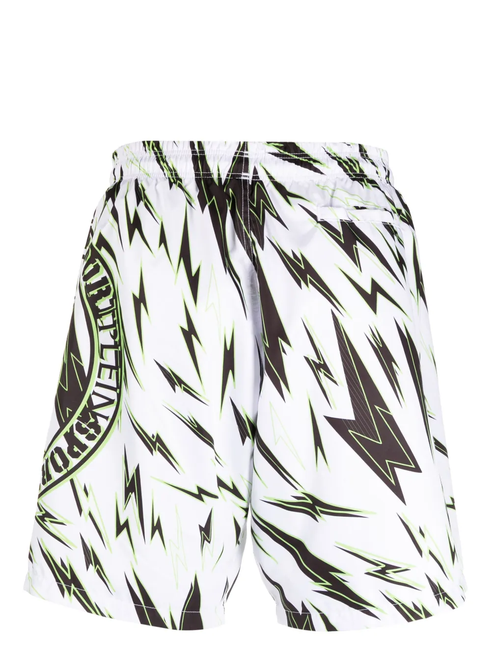 Wit, all-over grafische print, logoprint aan de zijkant, elastische tailleband met trekkoord en paspelzak aan de achterkant. Zwemkleding moet over je eigen kleding worden aangepast..
