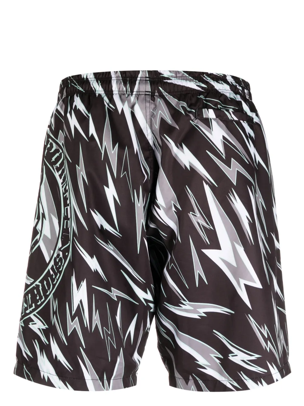 Zwart, all-over grafische print, logoprint aan de zijkant, elastische tailleband met trekkoord en paspelzak aan de achterkant. Zwemkleding moet over je eigen kleding worden aangepast..