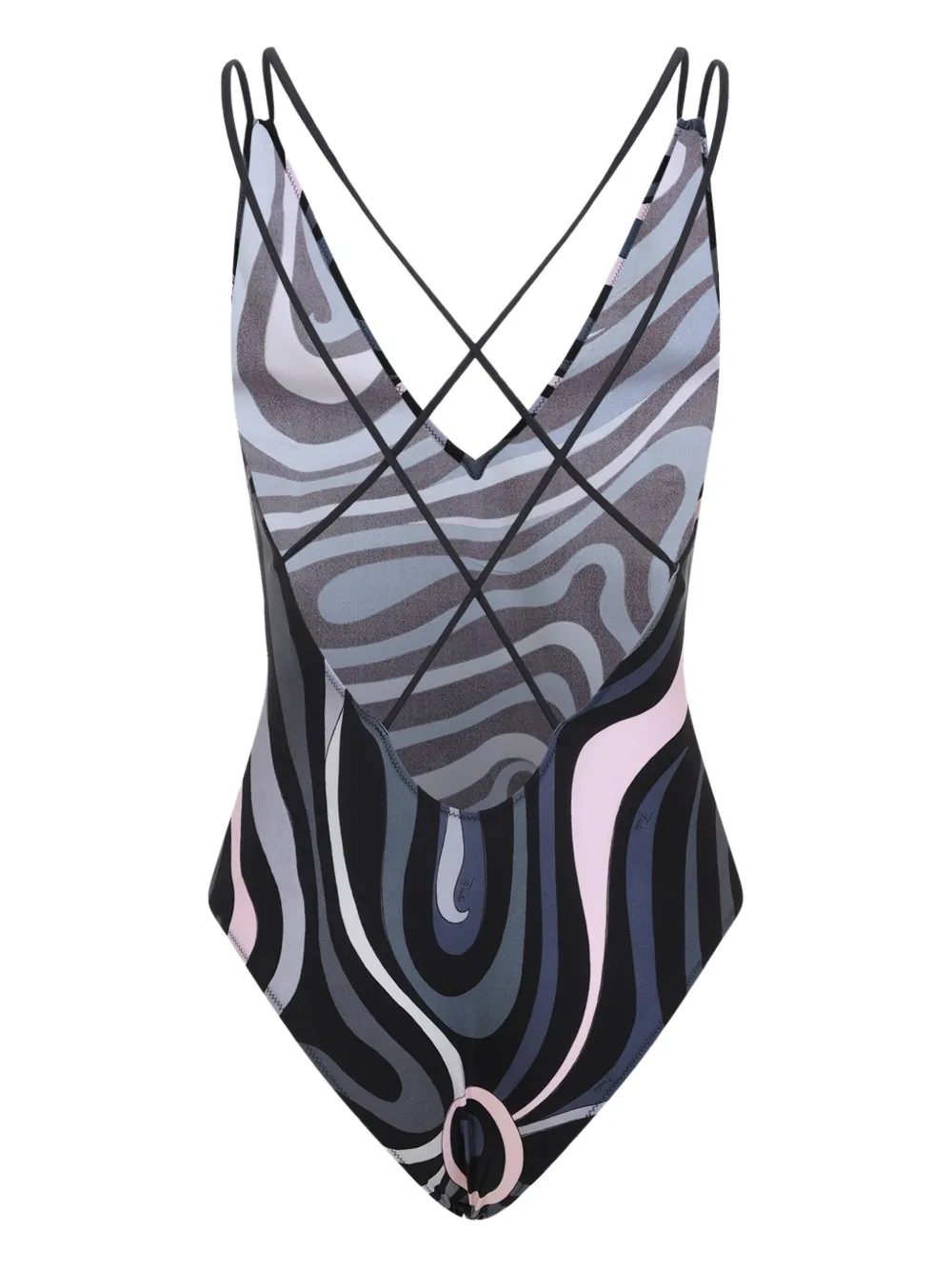 zwart gedraaid patroon gekruiste bandjes V-hals lage rug hoog uitgesneden Zwemkleding moet over je eigen kleding worden aangepast.