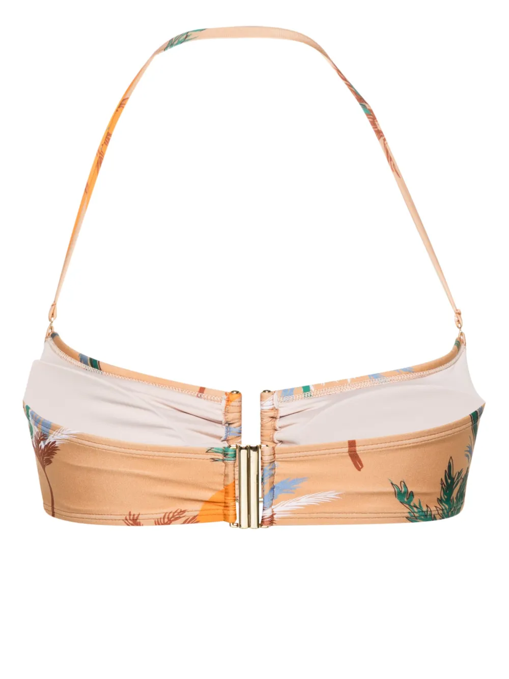 bruin/veelkleurig stretch design palmboomprint afneembare schouderband ruches met goudkleurig materiaal uitneembare pads sluiting aan de achterkant Zwemkleding moet over je eigen kleding worden aangepast.