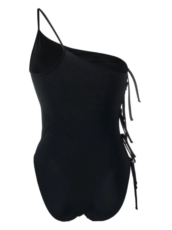 zwart stretch design geknoopt detail asymmetrische schouder gekruiste band Zwemkleding moet over je eigen kleding worden aangepast.