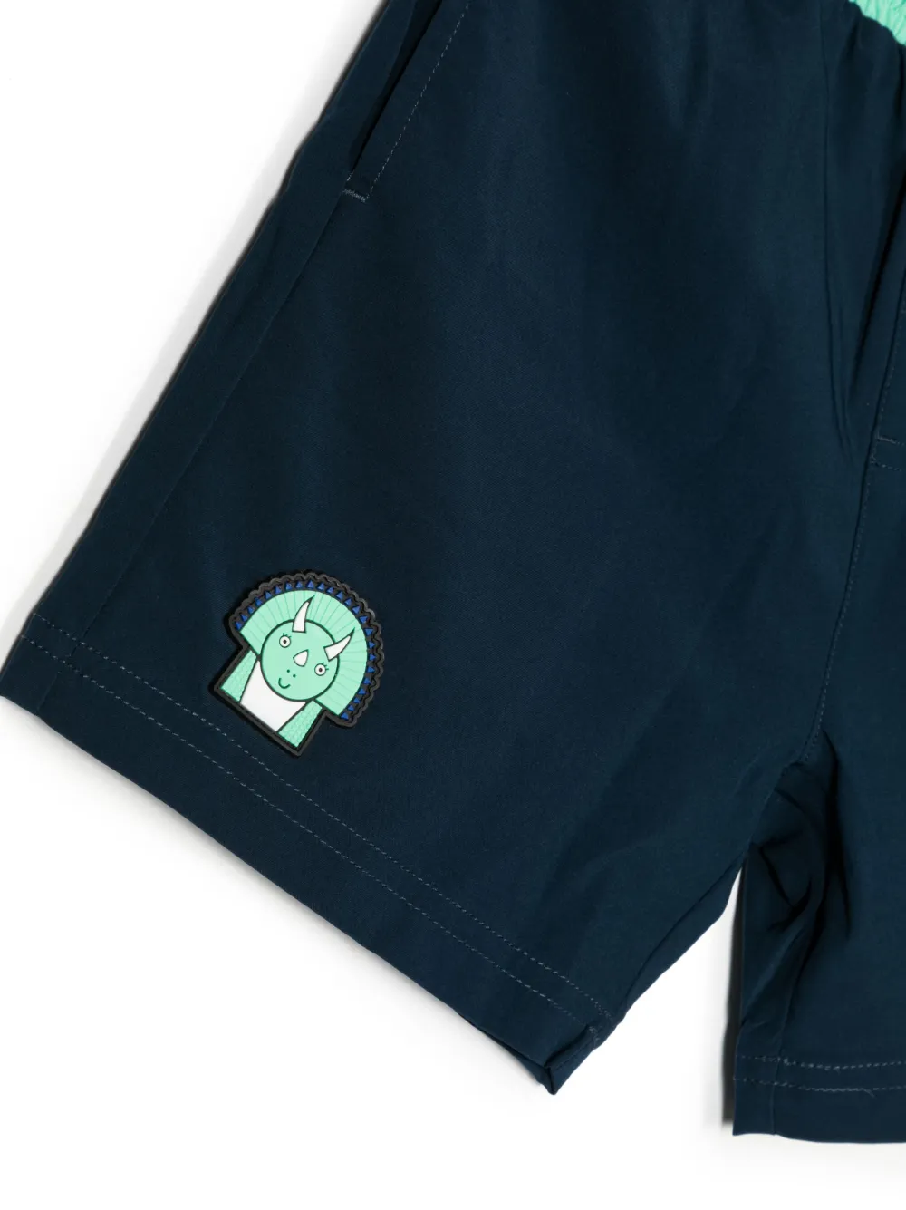 Marineblauw, mintgroen, patchdetail, elastische tailleband met trekkoord, twee steekzijzakken en rechte zoom. Zwemkleding moet over je eigen kleding worden aangepast..