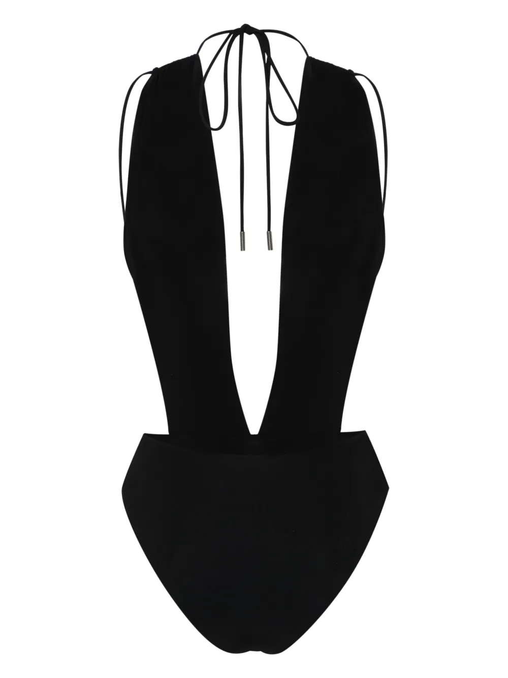 zwart stretch design zilverkleurige hardware met gegraveerd logo V-hals halternek striksluiting open rug hoog uitgesneden volledige voering Zwemkleding moet over je eigen kleding worden aangepast.