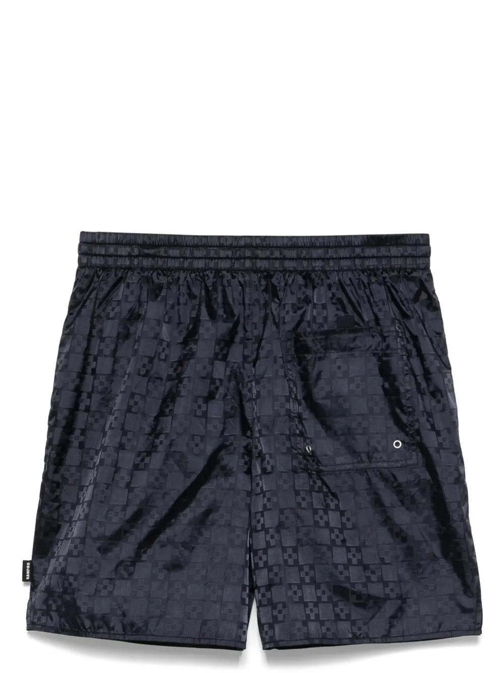 middernachtblauw vierkant kruispatroon elastische tailleband met trekkoord twee ingenaaide zijzakken opgestikte zak aan de achterkant volledige voering Zwemkleding moet over je eigen kleding worden aangepast.