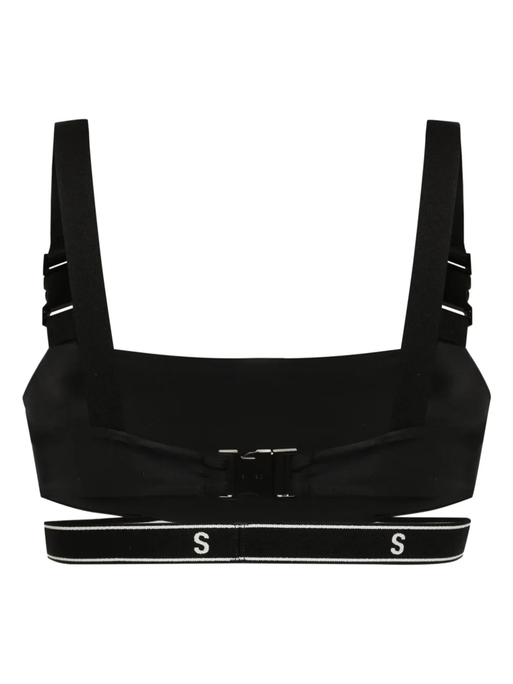 zwart ECONYL® mix stretch design uitgesneden detail bandeau vierkante hals schouderbandje met gespsluiting rechte open rug elastische logoband volledige voering Zwemkleding moet over je eigen kleding worden aangepast.