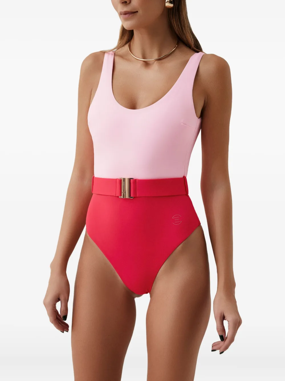 roze design met colourblocking ronde hals mouwloos goudkleurige gespriem Zwemkleding moet over je eigen kleding worden aangepast.