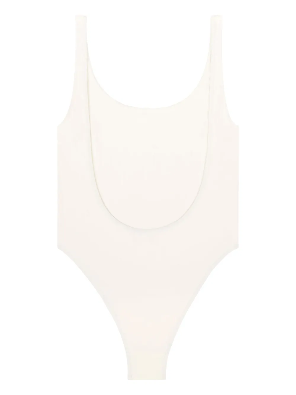 Crèmewit, stretch design, logoprint op de voorkant, ronde hals, dunne schouderbandjes, open rug en hoog uitgesneden. Zwemkleding moet over je eigen kleding worden aangepast..