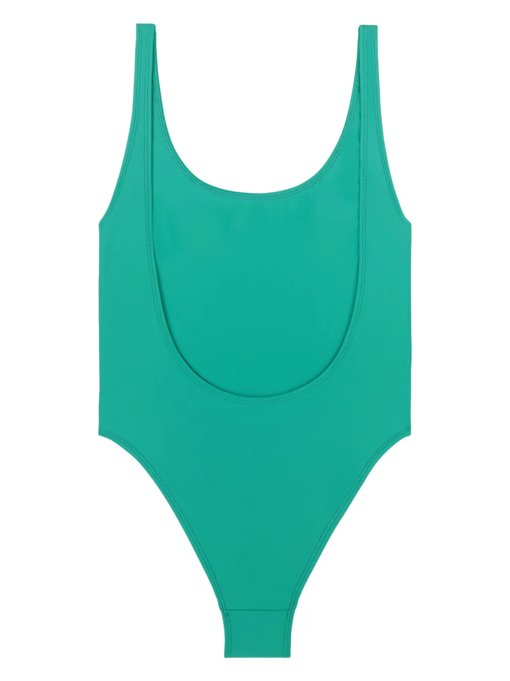 Jadegroen, stretch design, logoprint op de voorkant, ronde hals, open rug, mouwloos en hoog uitgesneden. Zwemkleding moet over je eigen kleding worden aangepast..