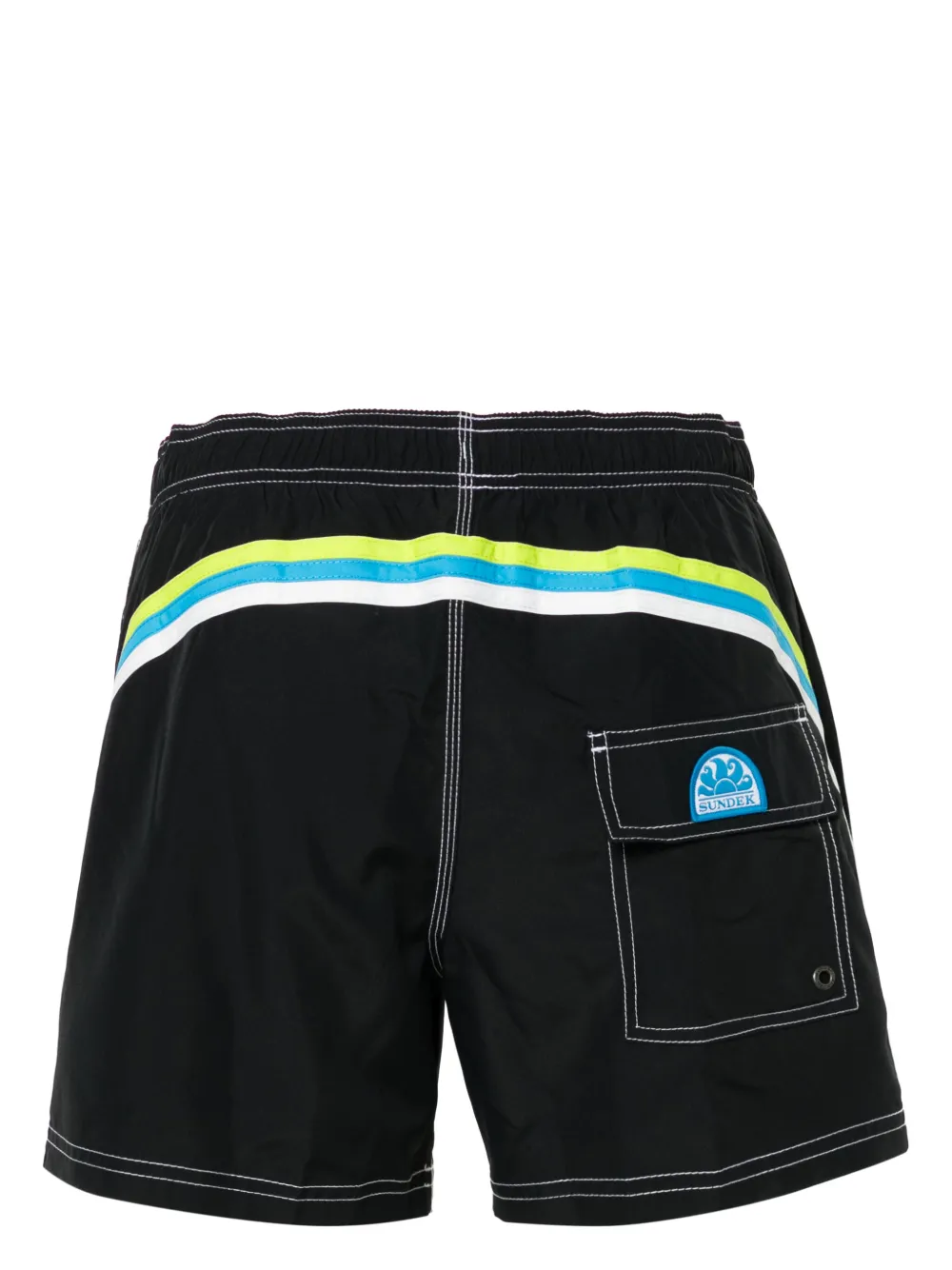 zwart contrasterende stiksels elastische tailleband twee steekzakken aan de zijkant klepzak aan de achterzijde veelkleurige regenboogpatches logopatch aan de achterkant metalen ringlets inwendige mesh slip trekkoordsluiting Zwemkleding moet over je eigen kleding worden aangepast.