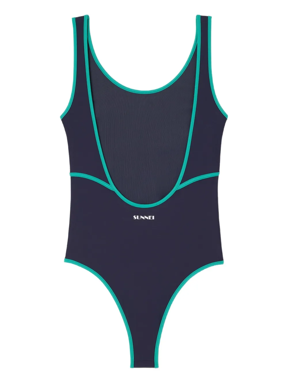 donkergrijs contrasterende afwerking diepe ronde hals mouwloos lage rug Zwemkleding moet over je eigen kleding worden aangepast.