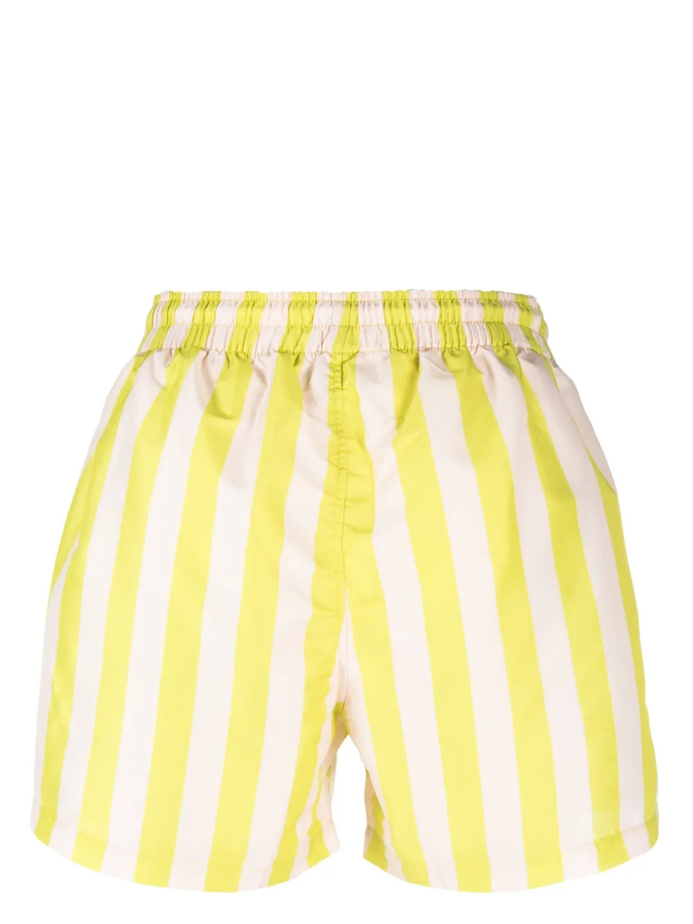 Limoengroen, licht beige, verticale strepenprint, logopatch aan de zijkant, elastische tailleband met trekkoord, twee steekzijzakken en mesh voering. Zwemkleding moet over je eigen kleding worden aangepast..