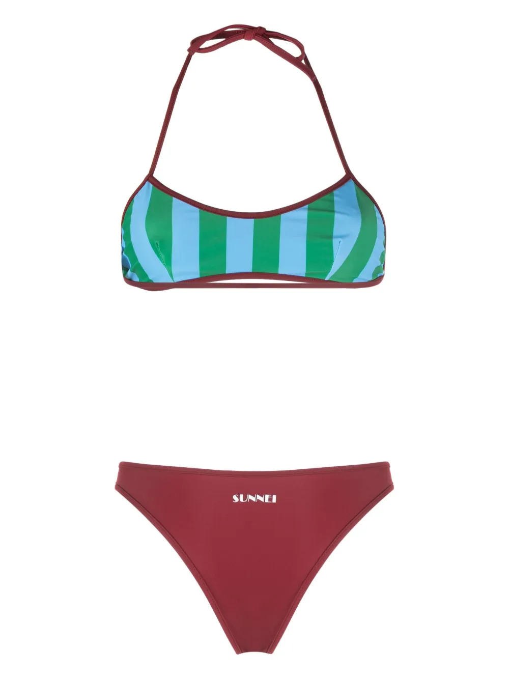Donkerrood, blauw, stretch design, logoprint op de achterkant, verticale strepenprint, omkeerbaar, ronde hals en halternek striksluiting. Zwemkleding moet over je eigen kleding worden aangepast..