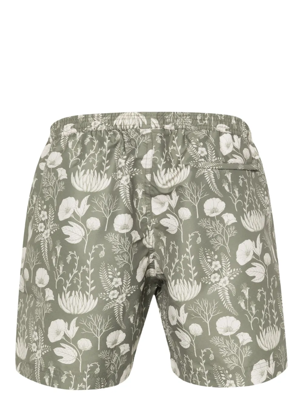 olijfgroen/lichtbeige gerecycled polyester botanische print twee steekzakken aan de zijkant korte zijsplitten dijlengte achterzak met ritssluiting mesh voering elastische tailleband met trekkoord Zwemkleding moet over je eigen kleding worden aangepast. Dit item wordt verkocht met een beschermhoes.