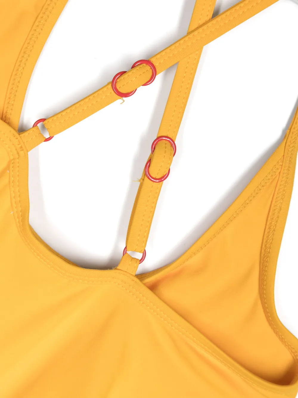 citroengeel stretch design grafische print op de borst logoprint op de voorkant diepe ronde hals verstelbare spaghettibandjes hoog uitgesneden ongevoerd Zwemkleding moet over je eigen kleding worden aangepast.
