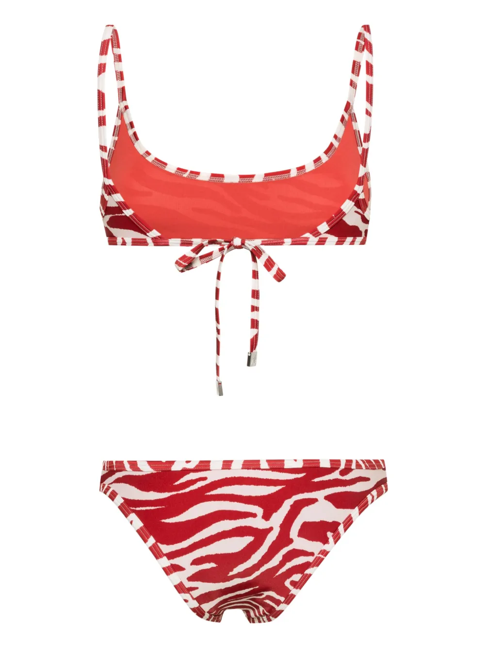 rood/lichtbeige stretch design abstract patroon Top: ronde hals dunne schouderbandjes mouwloos striksluiting aan de achterkant Broek: elastische tailleband klassieke bikinislip volledige voering instapmodel Zwemkleding moet over je eigen kleding worden aangepast.