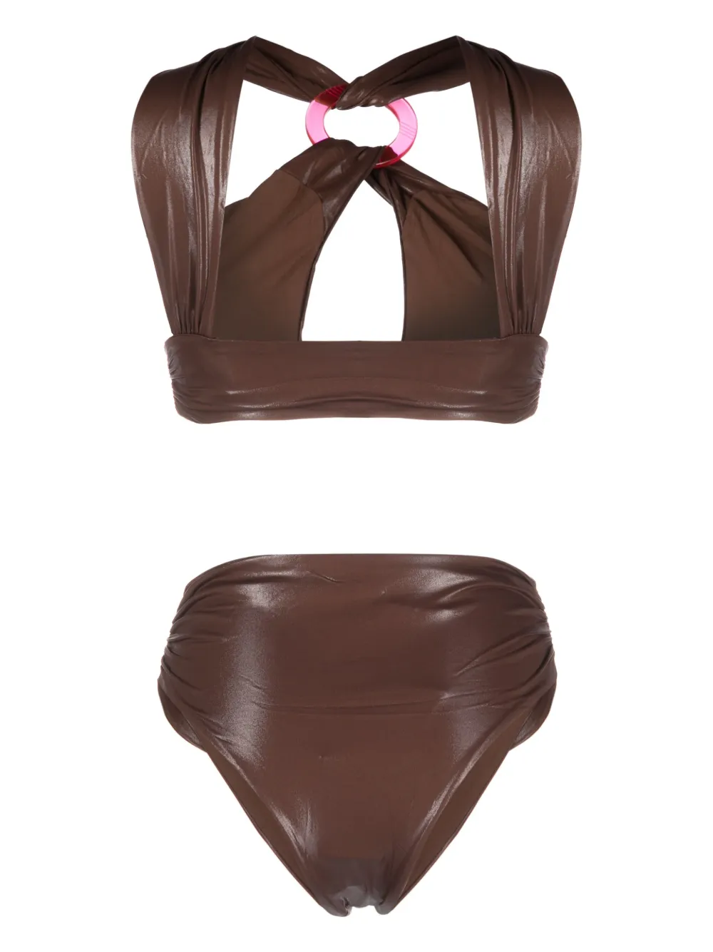 Bruin, imitatieleer, ringdetail, gedraaide details, brede schouderbandjes, triangel cup, high waist bikinislip en volledige voering. Zwemkleding moet over je eigen kleding worden aangepast..