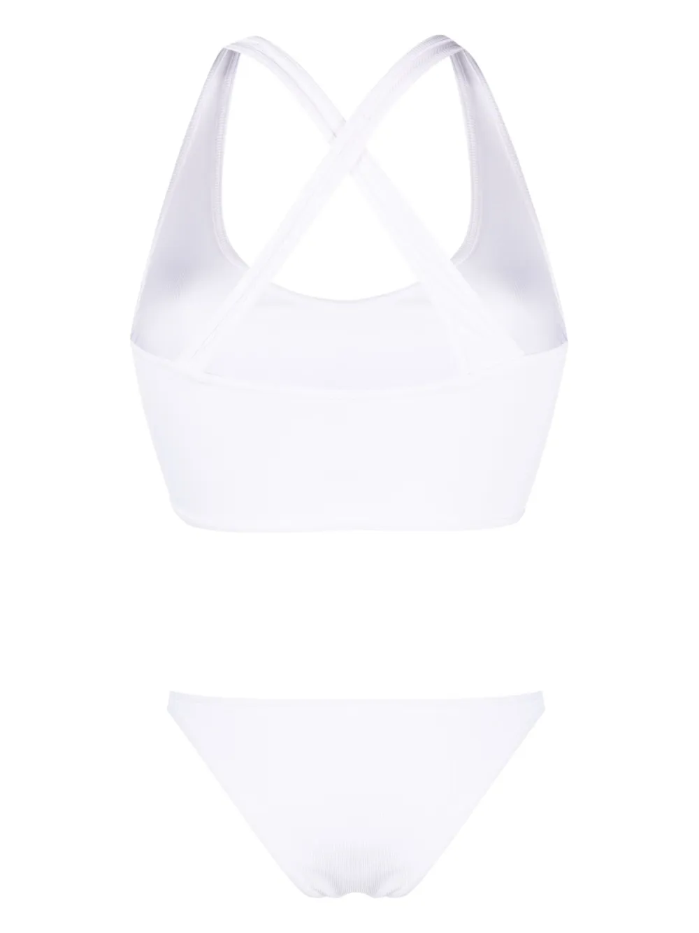 Wit, geribbelde details, ronde hals en gekruiste bandjes aan de achterkant. Zwemkleding moet over je eigen kleding worden aangepast..